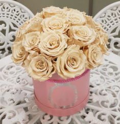 21 Miegančos rožės kompozicija dėžutėje. Galima keisti dėžutės ir rožių spalvas.